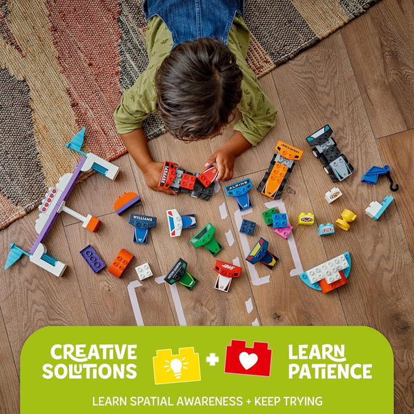 F1 TOY CARS – Transport kids to the world of Formula 1 with the F1 Team Race Cars & Drivers building toy for 2+ year old boys and girls WHAT'S IN THE BOX? – This toddler learning toy includes 10 buildable race car toys representing each of the Formula 1 teams, plus 3 driver bricks, a crane toy, starting lights and a podium ROLE-PLAY TOYS – The customisable cars come in authentic colours and are decorated with Formula 1 logos so toddlers can recreate exciting F1 race scenarios CRANE TOY ELEVATES THE FUN – Kids recreate the excitement of a pitstop and develop fine motor skills by attaching the toy cars to the hook to raise them for a speedy inspection GIFTS FOR TODDLERS – Celebrate the start of the F1 season with a creative toy that makes a fun birthday gift for 2+ year old boys and girls who love building with LEGO DUPLO bricks MORE F1 RACE ACTION – Look out for other LEGO Formula 1 construction sets (sold separately) to build, display and race with the whole family